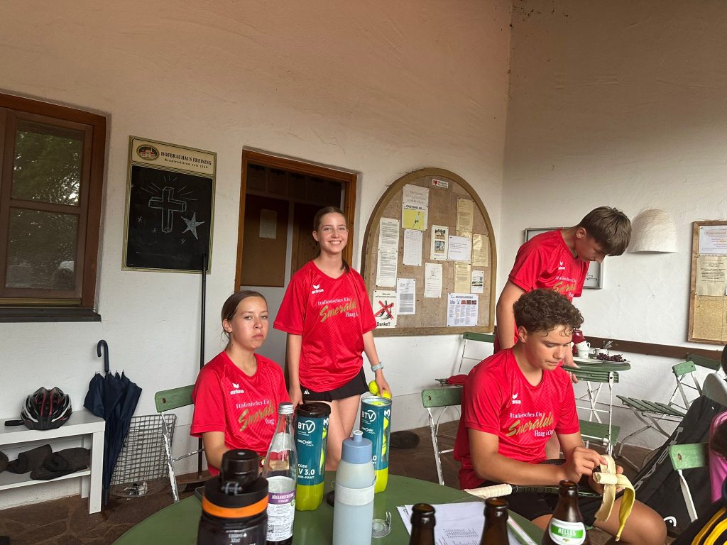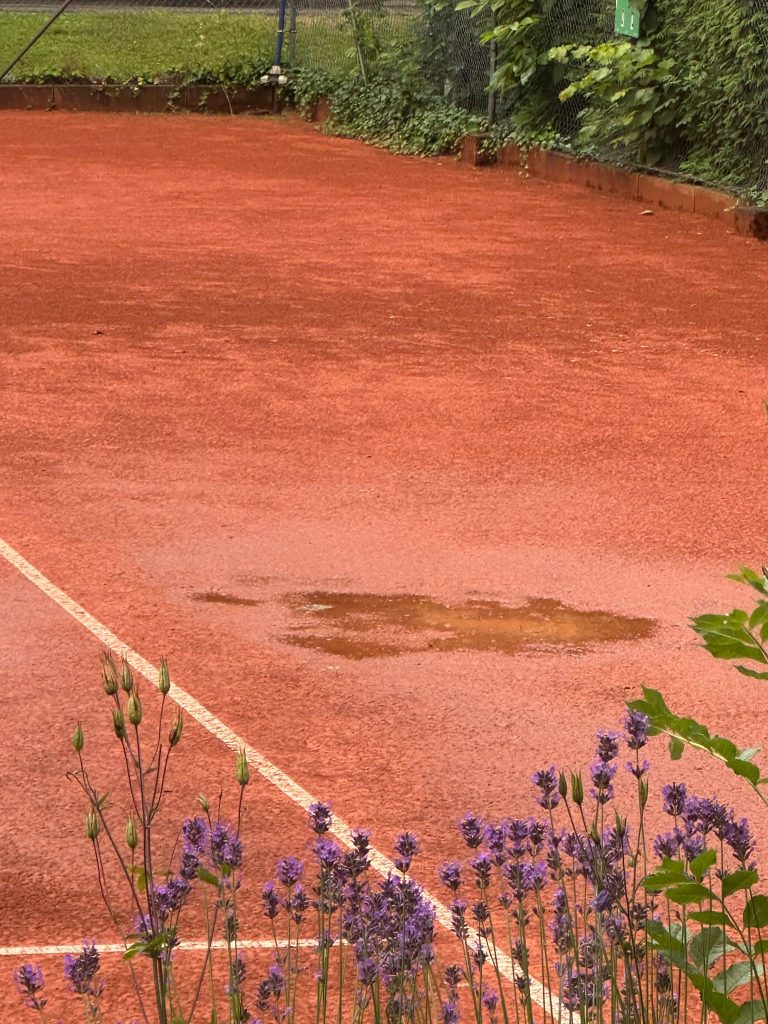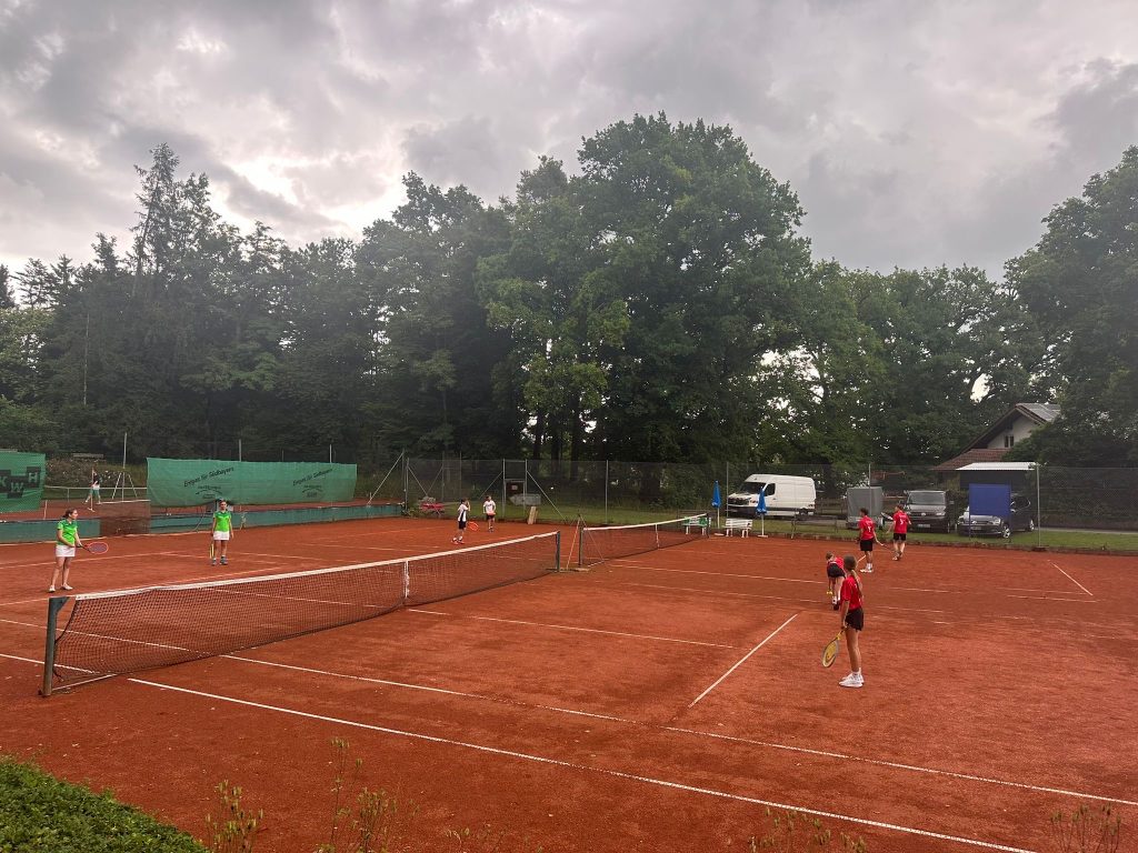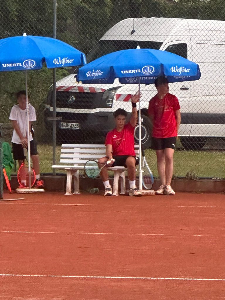 Was für ein Spieltag! Am Freitag 27.06.2025 stand unsere U15-Mannschaft einem wahren Wetterchaos gegenüber. Statt eines regulären Matches entwickelte sich das Spiel zu einer über fünf Stunden andauernden Regenschlacht mit mehreren Unterbrechungen. Teilweise glichen die Plätze eher einem Schwimmbad als einem Tennisplatz – an ein flüssiges Spiel war über weite Strecken kaum zu denken.